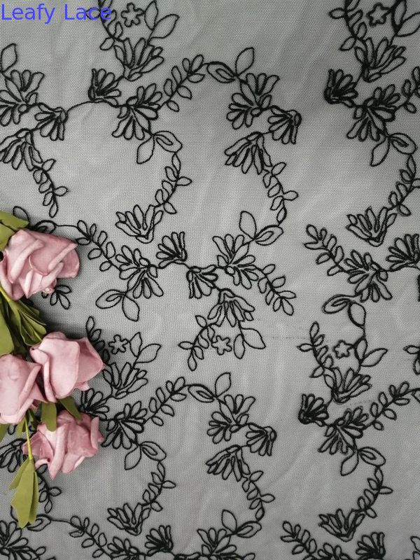 O bordado amarrado da flor preta por todo o lado na malha do tule da prata da tela do laço ou as mulheres contornam por muito tempo vestidos das meninas do vestuário do vestido, matérias têxteis da casa, cortina, artigos do fundamento, fatos, chapéus, vestidos de casamento, blusas, a camisa uniforme dos homens, etc.