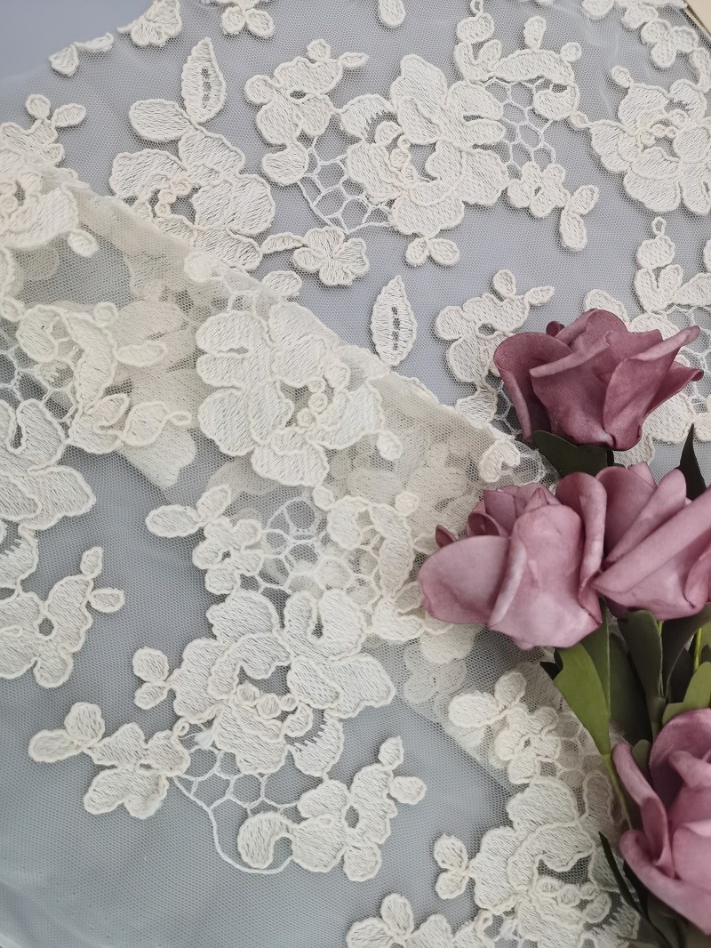 - Material: 3D laço amarrado floral Fabricis feito da tela de alta qualidade do poliéster de 100% com fio 100%cotton Cording. Esta tela amarrado floral super do laço 3D fornece o grande breathability.