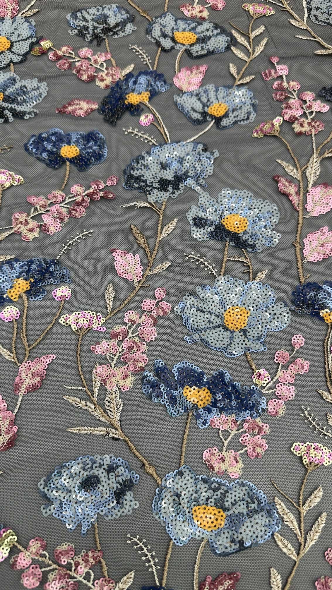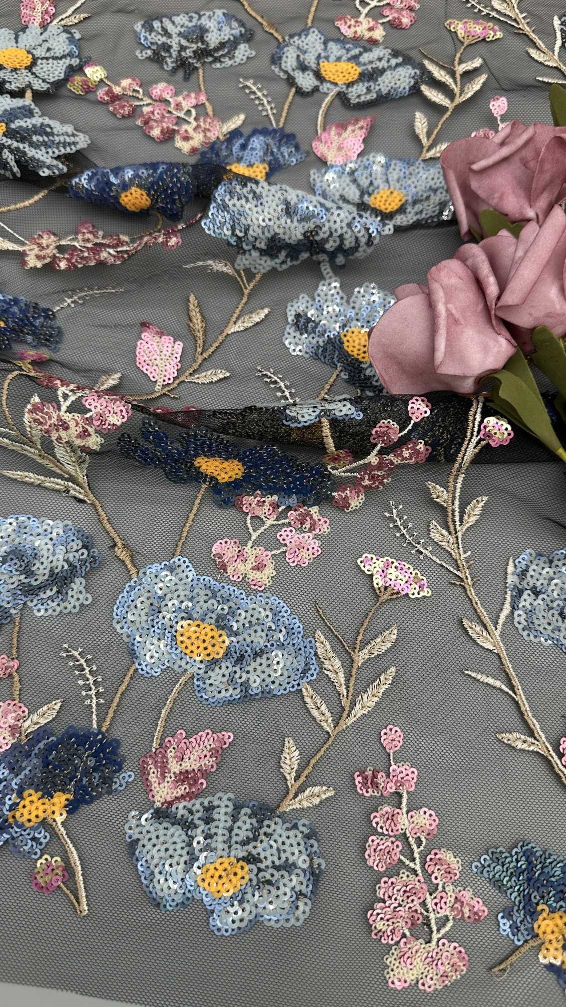 Procurando uma maneira de adicionar um pouco de glamour às vossas roupas, não procure mais do que o tecido bordado Sequin, o tecido perfeito para senhoras, mulheres, raparigas e até bebés.padrão floral de rosa, e delicado bordado de lentejas, este tecido é certo para fazer as cabeças virar.
