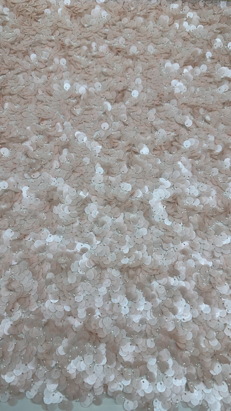 A cor deste tecido é uma linda tonalidade champanhe, um tom quente e convidativo que exala luxo e é versátil o suficiente para complementar uma ampla gama de paletas de cores.A cor champanhe é especialmente popular em roupas de noiva e de noiteEsta cor elegante, combinada com o brilho das lentejuelas,torna o tecido bordado de flower sequin uma escolha para designers e entusiastas do bricolage.
