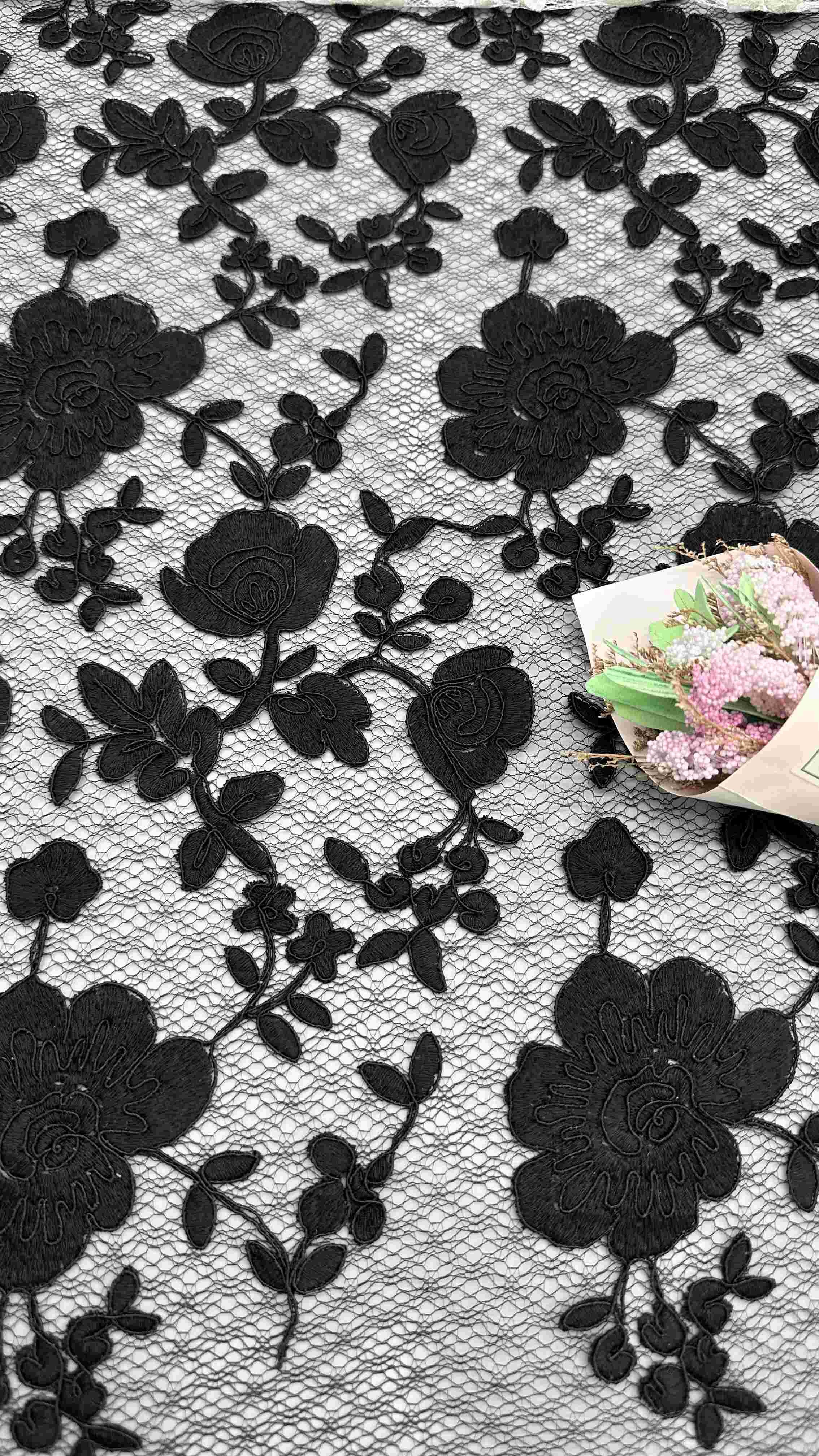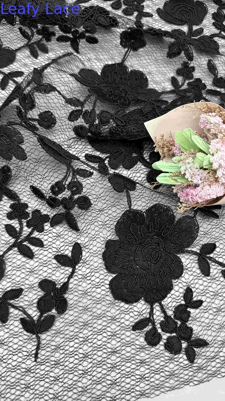 Destacar: | Tecido de renda de malha bordada com padrão floral,Tecido de renda de malha bordada preta,Tecido de renda de malha bordada de 129 cm |