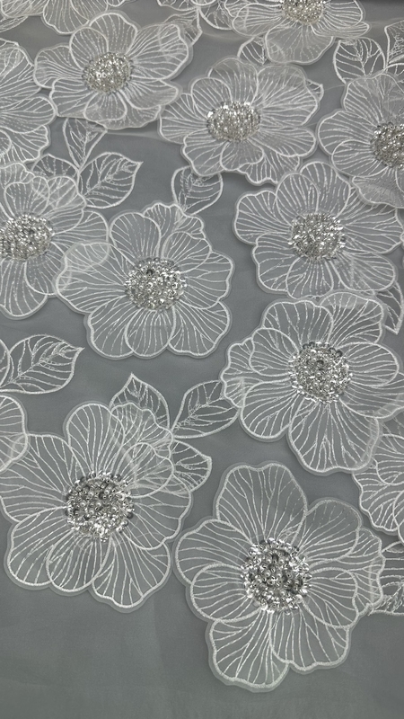 O tecido de bordado de renda com delicados motivos foliares é uma escolha popular para vestidos de casamento e festa, oferecendo elegância, textura e detalhes intrincados. A tecnologia por trás de sua produção envolve uma mistura de artesanato tradicional e inovações têxteis modernas.