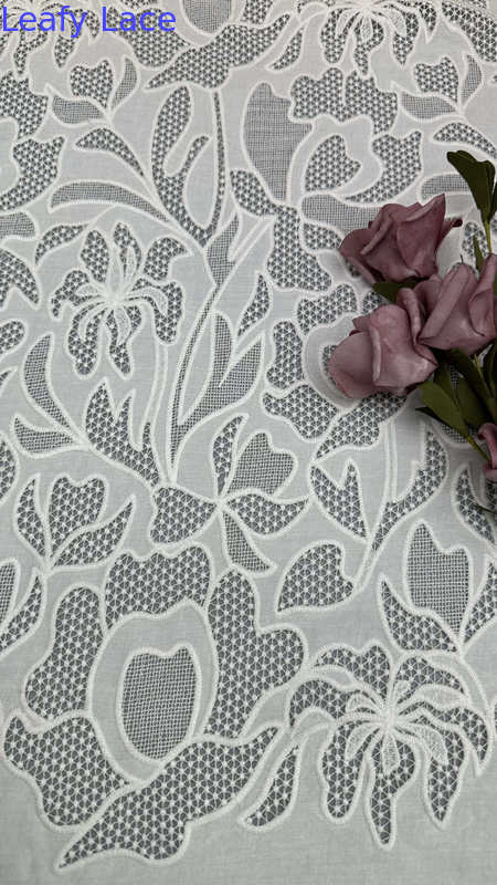 O tecido de bordado de renda com delicados motivos foliares é uma escolha popular para vestidos de casamento e festa, oferecendo elegância, textura e detalhes intrincados. A tecnologia por trás de sua produção envolve uma mistura de artesanato tradicional e inovações têxteis modernas.