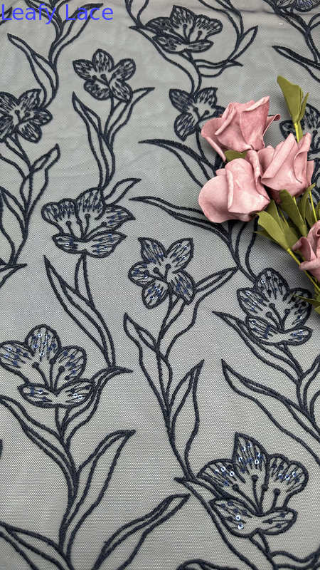 O tecido bordado de renda com motivos delicados de folhas é uma escolha popular para vestidos de casamento e de festa, oferecendo elegância, textura e detalhes intrincados.A tecnologia de produção é uma mistura de artesanato tradicional e inovações têxteis modernas.