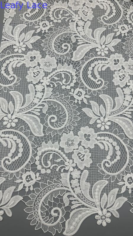 O tecido de bordado de renda com delicados motivos de folhas é uma escolha popular para vestidos de casamento e festa, oferecendo elegância, textura e detalhes intrincados. A tecnologia por trás de sua produção envolve uma mistura de artesanato tradicional e inovações têxteis modernas.
