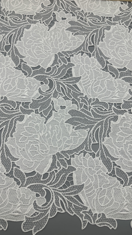O tecido bordado de renda com delicados motivos de folhas é uma escolha popular para vestidos de casamento e de festa, oferecendo elegância, textura e detalhes intrincados.A tecnologia de produção é uma mistura de artesanato tradicional e inovações têxteis modernas.